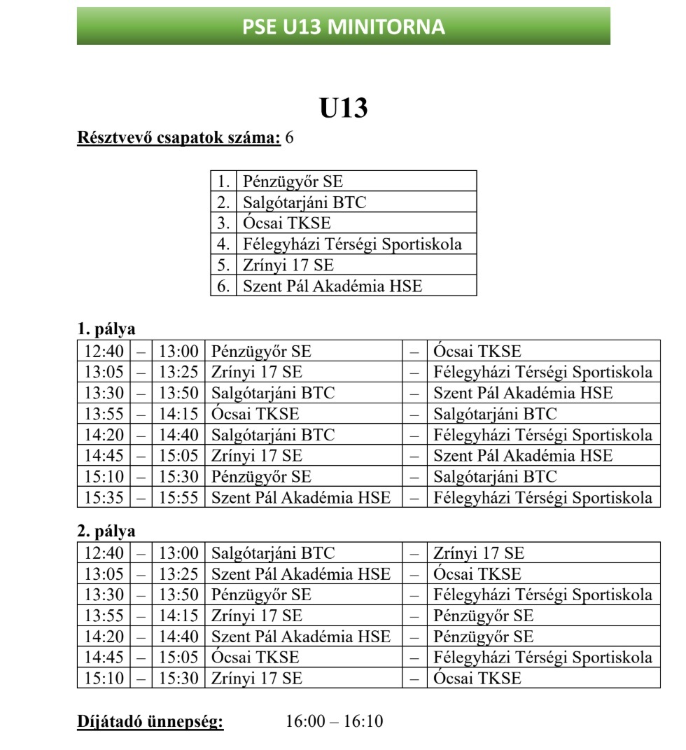 A nemrégiben lezajló U11-es tornánkat követően újabb korosztály számára szervez kupát egyesületünk. 2026. február 22-én, vasárnap az U13-as labdarúgó-palánták rúghatják a bőrt a Kőér utcai Sporttelepen. 6 együttes fogja képviselni magát az eseményen. 12 óra 40 perckor veszi kezdetét a rendezvény. A 3/4 pályás bajnoki rendszerben megszokott szabályok lesznek érvényben, egy mérkőzés 20 percig tart. A résztvevők névsora ismét színesnek nevezhető. Reméljük, ezúttal az időjárás is kegyeibe fogadja majd a megjelenteket. Minden érdeklődőt szeretettel várunk!